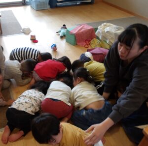 年度当初、驚いて泣いていた子もいましたが、今では放送が聞こえるとすぐに保育士の周りに集まり「ダンゴムシ」のポーズ!お話をしたりせず誰もが真剣な表情…毎月訓練を行うことの積み重ねの大切さを感じます。