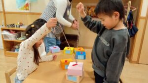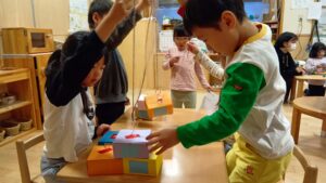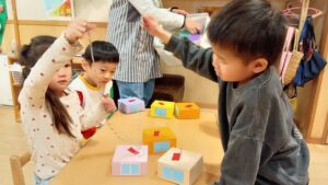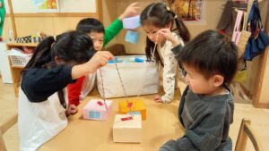 時には、年長のお友だちが、年少、年中のお友だちに遊び方を教えたり、一緒に手伝う姿も見られました。