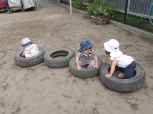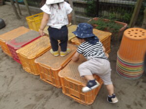 最近は友だちとの関わりが増え、友だちのしていることを見て真似をする姿もよく見られるようになりました。少し高さのあるコンテナに登るのを初めは怖がっていた子どもも友だちがしているのを見て真似して挑戦したり、一人が何かを始めるとだんだん集まってきて数人が同じことをする姿も見られ、とてもかわいいです。