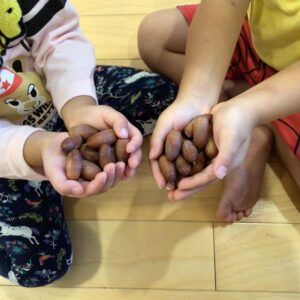 そんな会話を2歳児れんげぐみさんとしました。しばらくして「せんせ~もってきたよ!」とれんげさんが袋を持って届けに来てくれました。袋にはどんぐり、どんぐりの葉、枝がたくさん!